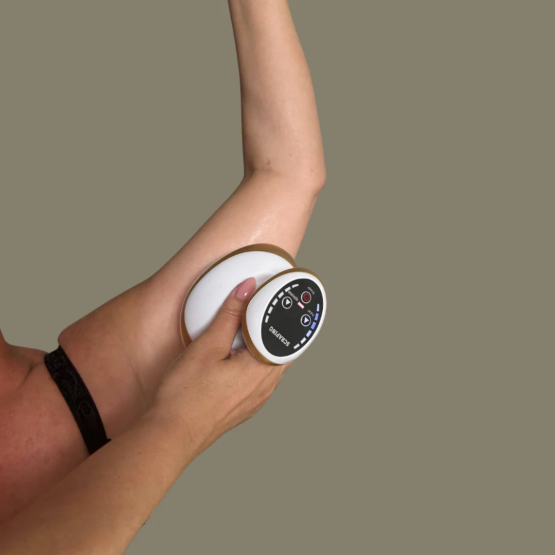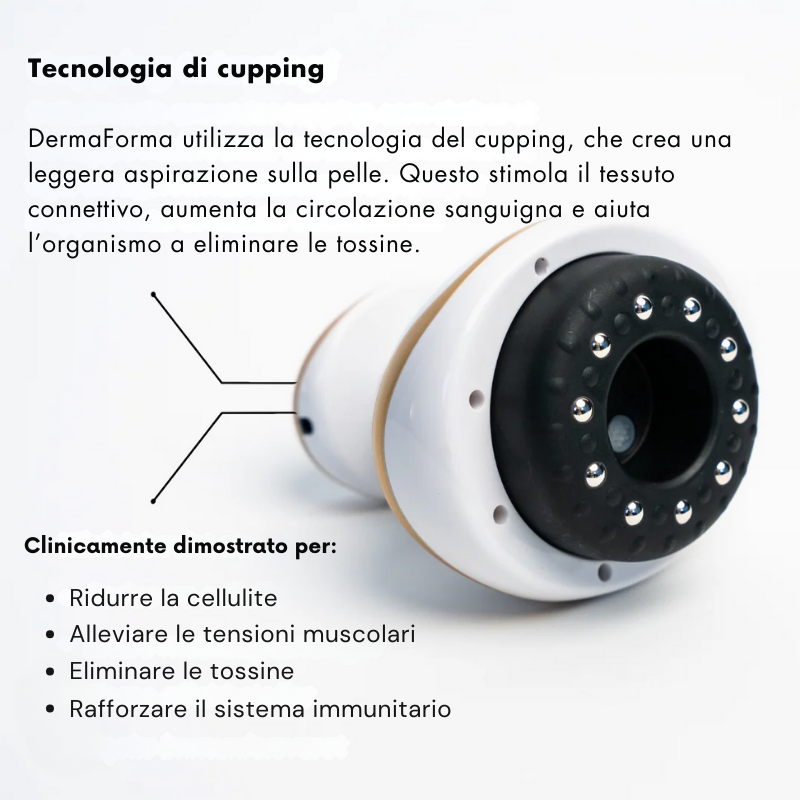 La tecnologia DermaForma combina il calore, il gua sha (tecnica di raschiamento) e le ventose. Questa combinazione unica migliora la circolazione sanguigna e il drenaggio linfatico, favorendo l’eliminazione delle tossine e la riduzione della cellulite (pelle a buccia d’arancia).