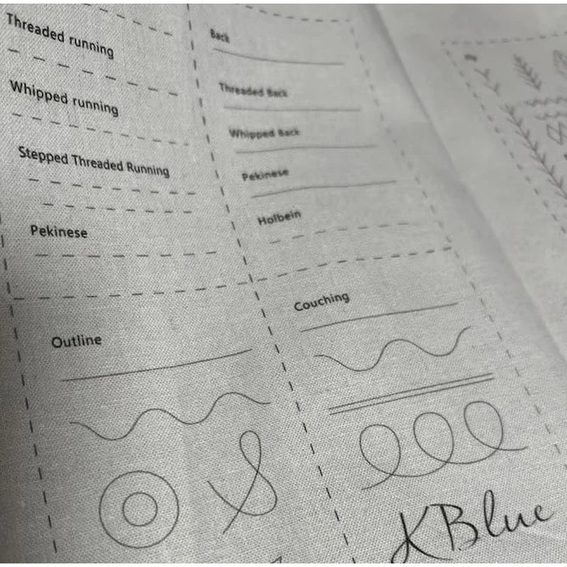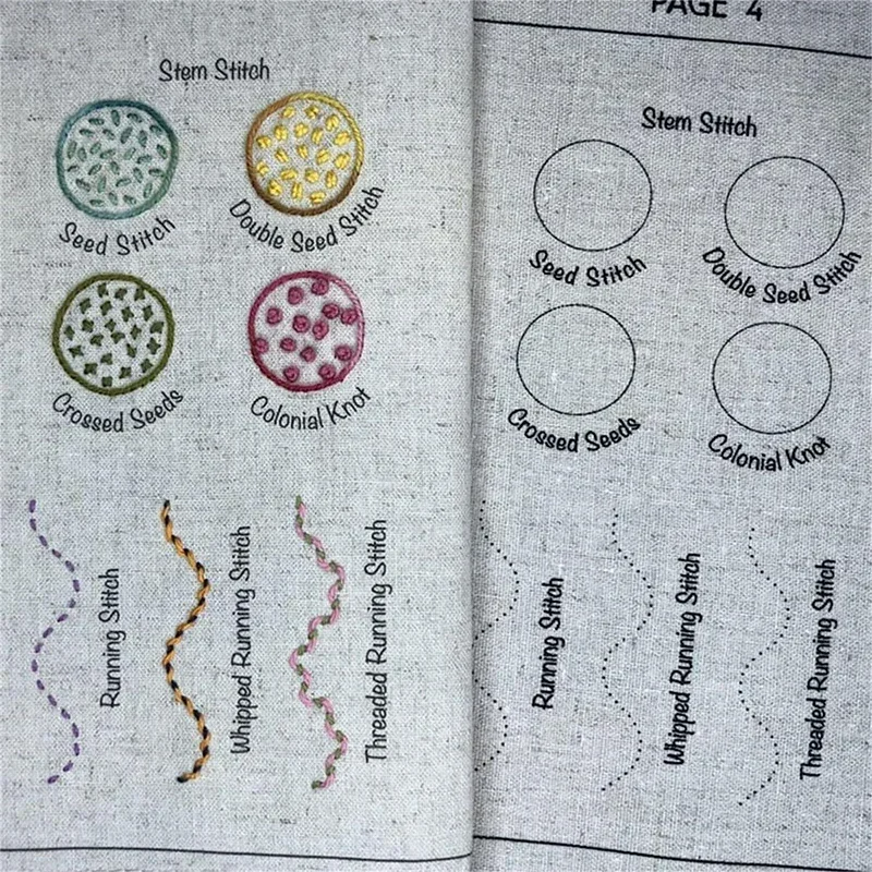 Il libro di ricamo è composto da pagine in tessuto morbido con i nomi dei punti in inglese, per guidarti passo dopo passo.