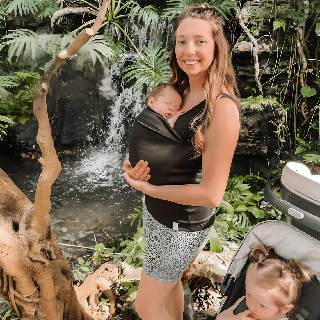 Il suo tessuto morbido, elasticizzato e traspirante si adatta a ogni momento della tua vita da genitore.