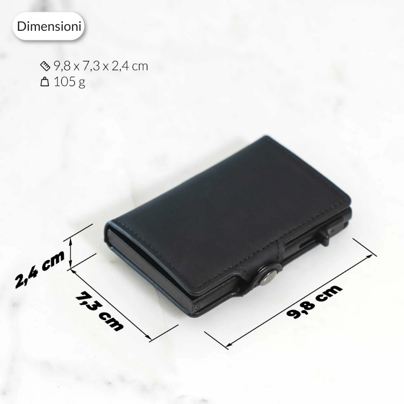 Il rivestimento esterno del porta-carte è realizzato in pelle tecnica vegana (poliuretano), un’alternativa premium e durevole alla pelle vera. Questo materiale conquista per la sua resistenza, l’eleganza e la piacevole sensazione al tatto. Non ha nulla da invidiare alla pelle tradizionale in termini di estetica e funzionalità, distinguendosi al tempo stesso per il suo carattere ecologico e cruelty-free.