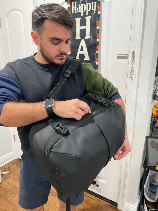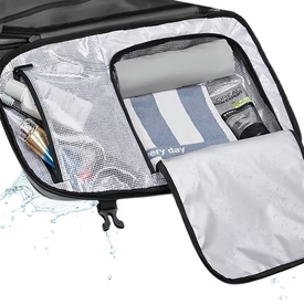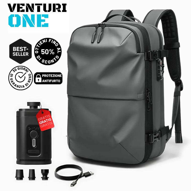 Il Venturi ONE offre una capacità espandibile da 60 a 75 litri grazie al suo sistema di compressione sottovuoto integrato. Ti permette di portare fino al 50% di oggetti in più senza superare le dimensioni del bagaglio a mano.